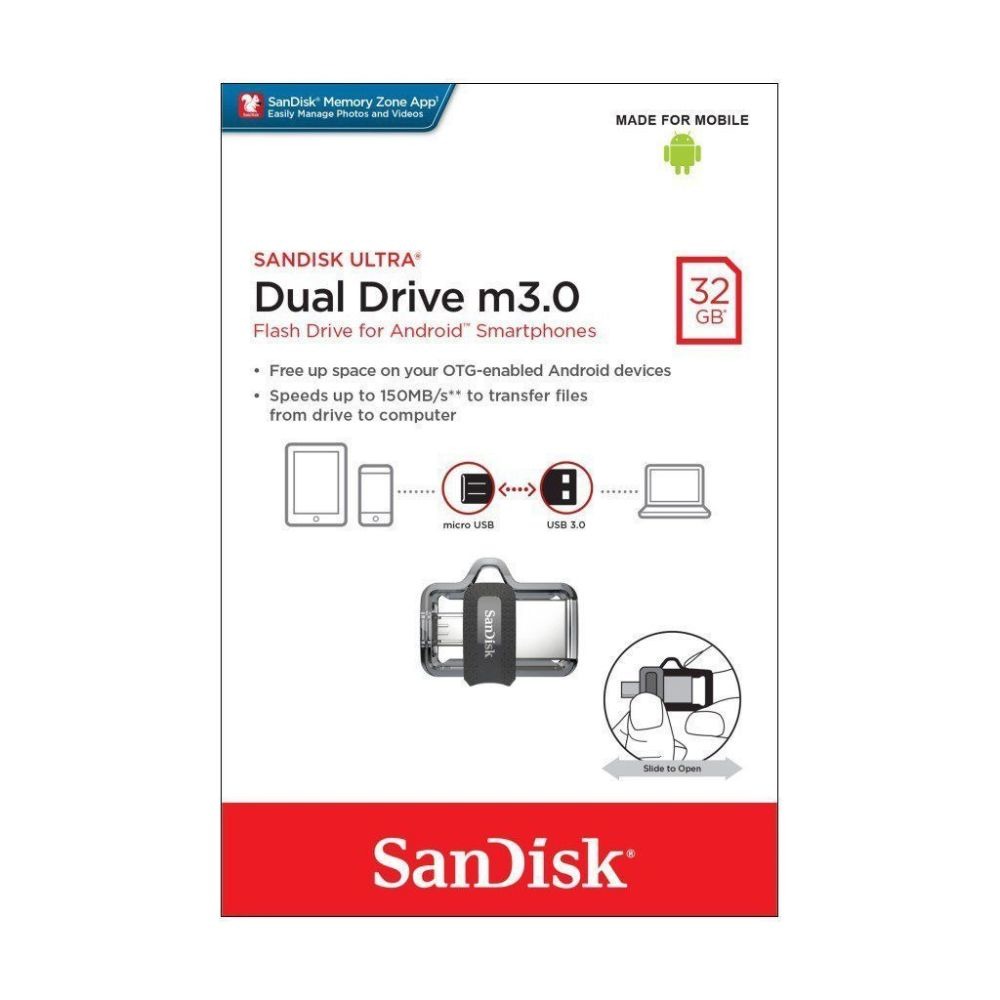 The SanDisk Ultra Dual Drive m3.0 makes it easy to transfer content from your phone to your computer. With a micro-USB connector on one end and a USB 3.0 connector on the other, the drive lets you move content easily between your devices—from your Android smartphone or tablet to your laptop, PC or Mac computer (1). The USB 3.0 connector is high-performance and backward-compatible with USB 2.0 ports. The SanDisk Memory Zone app for Android (available on Google Play) (2) helps you manage your device’s memory and your content.